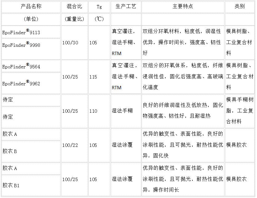 該系列包含模具灌注樹脂、手糊樹脂、膠衣,可配合使用。具備優異的機械性能、耐熱性。