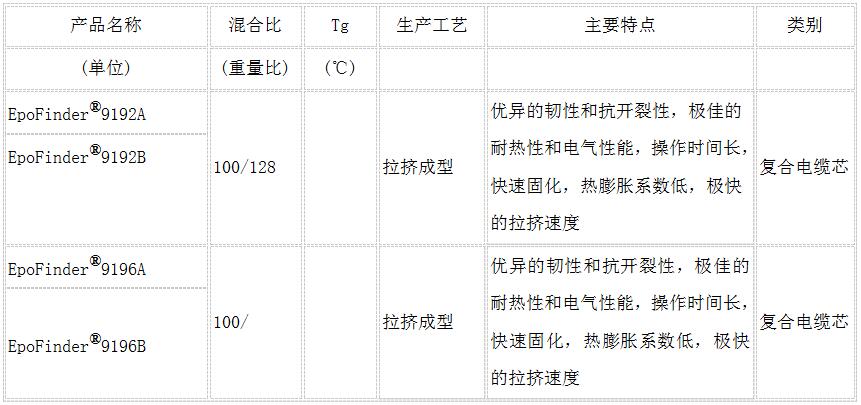針對拉擠工藝的環氧系列材料,100%不含揮發組分,通過特有的先進技術,同時達到了優異的韌性和極佳的耐熱性。該系列材料還能很好地滿足高拉擠速度和高Tg的要求。