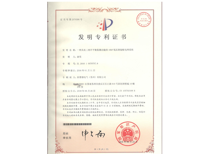 10KV智能柜監測發明專利證書